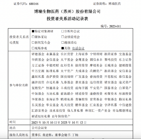 据博瑞医药公开披露的《2023年10月10日至10月12日投资者调研报告》(以下简称报告)显示,公司接待了大量的机构投资者。