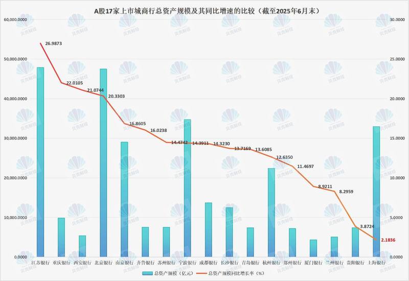 - 垫底A股上市城商行!谁拉低了上海银行总资产规模的同比增速水平2025年对于上海银行(601229.SH)来说,是一个不太平静的年份。在这一年中,一方面市场看到,新董事长顾建忠等管理层自掏腰包增持股票、显示对公司发展的信心;另一方面上海银行又因多项违规成为城商行体系在2025年内的“罚单王”“罚金王”。 当前,上海银行的总资产规模增速亦成为需要关注之处。 Wind显示,截至2025年6月末,上海银行以约3.29万亿元的总资产规模,在A股17家上市城商行中位列第四,但是其2.18%的同比增速水平,已让上海银行在这17家上市城商行中处于垫底水平。 图/新京报贝壳财经记者根据Wind数据制图 而这种在同业比较中处于“倒数三甲”的总资产同比增速水平,上海银行自2024年三季度以来已连续了多个季度。 是谁拉低了上海银行的增速水平?这家银行接下来又意欲如何调整? 零售端个贷同比增速近五年首次进入负增长通道 9月19日,上海银行举办了2025年上海辖区上市公司集体接待日暨中报业绩说新京报