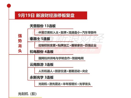 - 9月19日沪深两市涨停分析:天普股份13连板,泰慕士5连板三大指数小幅下跌,两市成交缩量超8000亿,机器人板块集体调整。天普股份13连板,泰慕士5连板,一图看懂>>股市直击