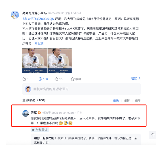 - 私募大佬但斌怼科大讯飞刘庆峰:屁大点本事,就牛逼哄哄的不得了近日,科大讯飞董事长刘庆峰的一番言论引发了市场的广泛关注与争议。刘庆峰在公开场合表示,埃隆·马斯克对人工智能的理解存在不足。此言论一出,立即引起了各界的热议,其中不乏质疑与批评之声。 私募大佬但斌在社交媒体上对庆峰的言论进行了直接回应。但斌表示:“他(庆峰)就像我见过的金融行业里某些人,本事不大,却非常自大,难道不能谦虚一点吗?”但斌的这番言论,不仅直接点出了刘庆峰言论的不当之处,也引发了市场对科大讯飞在人工智能领域实际表现的进一步审视。 也有网友表示,虽然科大讯飞在AI领域中起了个大早。但目前除了卖卖学习机,嘎嘎韭菜,也没别的建树,令人唏嘘。这公司赶上了AI浪潮,但盈利能力并没有啥改善。原因何在?是因为太懂了吗? 此次事件也引发了市场对科技企业领导者言论责任的思考。作为企业的掌舵人,其言论不仅代表个人观点,更可能影响市场对公司的认知和预期。因此,如何在表达观点时做到客观、谨慎,是每一新浪基金