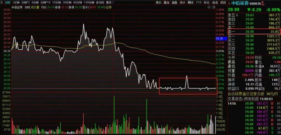 - 中信证券惊现31亿元压盘大单,昨日多只券商股午后直线跳水,怎么回事?只要在资本市场时间够久,你总能看到各种各样做梦也想不到的事儿。 9月17日午后,“券商一哥”中信证券突然直线跳水。但若说是跌幅,仅仅从上涨0.61%,到最多下跌1.02%,振幅还不足2%。13:00至13:30,中信证券成交金额为18.48亿元,换手率0.52%。 然后,13:30至15:00,中信证券一直低位徘徊。其中14:24到14:26有短暂小反抽,但只是昙花一现,最后半小时几乎走成了一条直线。而卖一压单高达31亿元之多。 作为A股流通市值超过3500亿元的“券商一哥”,大单压顶之下,分时图乍一看仿佛跌停板,再仔细一看原来才跌了不到1%。 不仅是中信证券,多只头部券商股也出现了类似的走势。 下面是国泰海通: 卖一压单7.6亿元,跌幅0.99%。 招商证券:卖一压单2.2亿元,跌幅0.96%。 仿佛有一只无形的手,在调控券商股。尤其是3900点关口,这种走势引每日经济新闻