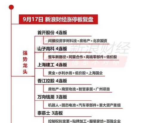 - 9月17日沪深两市涨停分析:首开股份、山子高科、上海建工、香江控股4连板创业板指放量上涨1.95%再创3年多新高,芯片、机器人板块联袂大涨。首开股份、山子高科、上海建工、香江控股4连板,一图看懂>>股市直击