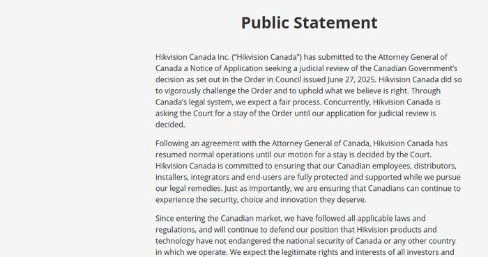 - 海康威视:加拿大公司向加检方申请审查加政府决定,公司暂已恢复运营转自:北京日报客户端海康威视7月7日发布公告称,海康威视加拿大公司已向加拿大总检察长提交申请,寻求对加拿大政府停止其在加所有业务的决定进行司法审查。声明称,在与加拿大总检察长达成协议后,海康威视加拿大公司已恢复正常运营,直至法院对公司提出的暂缓执行申请作出裁决。海康威视表示,自进入加拿大市场以来,遵守所有适用的法律和法规,公司将继续捍卫其立场,即海康威视的产品和技术没有危及加拿大或公司运营所在的任何其他国家/地区的国家安全。 6月27日,加拿大高级官员在社交媒体表示,加政府在进行国家安全审查后,认为海康威视在加继续运营将损害加国家安全,已命令其停止在加运营并关闭在加业务,并称加政府还禁止政府部门购买或使用海康威视产品。6月30日,中国商务部新闻发言人就加拿大政府关闭海康威视在加业务事答记者问表示,加方以“国家安全”为由,强行关闭海康威视在加业务,并禁止加政府部门购买或使用海康威视产品,中方对此强烈不满、坚决反对北京日报