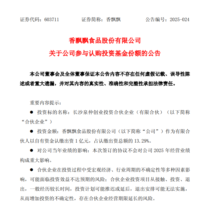 - 香飘飘做LP,出资1亿元原标题:香飘飘做LP,出资1亿元投资界-解码LP消息,香飘飘食品股份有限公司发布公告,公司于2025年7月7日与苏州维特力新创业投资管理有限公司(简称“苏州维特力新”)及其他有限合伙人共同签署了《长沙泉仲创业投资合伙企业(有限合伙)合伙协议》。公司作为有限合伙人以自有资金认缴出资人民币1亿元,占认缴出资总额的13.29%。该基金主要投资于成长及成熟期企业,适当兼顾有良好发展前景且孵化路径比较明晰的早期消费类企业。 据悉,该基金首期募集规模6.52 亿元,基金目标总规模为10 亿元,已在中国证券投资基金业协会完成备案,基金编号为SANQ22。该基金投资范围:立足长沙、辐射全国,主要投资于大消费产业,投资于该产业的资金不得低于基金实缴总额的 80%。据官网介绍,香飘飘食品股份有限公司 成立于2005年, 位于浙江省湖州市, 是一家以从事酒、饮料和精制茶制造业为主的企业。投资界