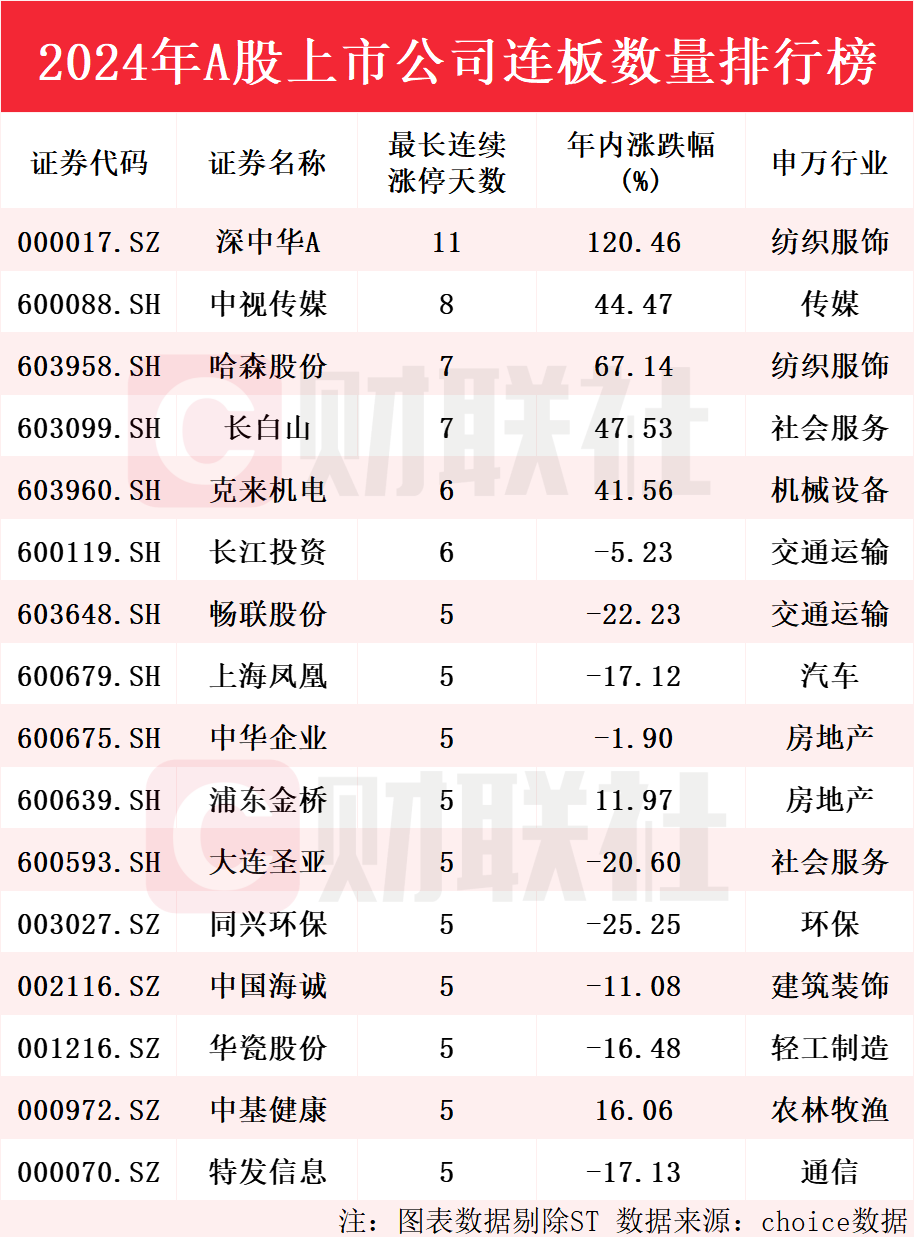- 深中华A一度十一连板连续涨停天数最多 连板牛股名单来了财联社2月10日讯(编辑 笠晨)2024年A股兔年市场红盘收官,逾千股涨停或涨超10%,热门概念层出不穷,也跑出一众连板牛股。Choice数据显示,年初迄今,主要业务为珠宝黄金业务、自行车及锂电池材料业务的“华字辈”个股深中华A跑出11连板连续涨停板天数最多,中央电视台旗下上市公司中视传媒斩获8连板位列第二;拥有外销业务叠加并购重组的哈森股份、拥有国家滑雪基地、冰雪旅游季产品的吉林本地股长白山皆拿下7连板,主营工业自动化应用的新质生产力概念龙头克来机电、最终控制人为上海国资委的长江投资均录得6连板。此外,畅联股份、上海凤凰、中华企业、浦东金桥、大连圣亚、同兴环保、中国海诚、华瓷股份、中基健康和特发信息于年内最长连续涨停板天数皆为5次。 “新年第一妖股”深中华A主营业务为自行车及锂电池材料业务、珠宝黄金业务。深中华A财报显示,公司现在办公地址为深圳市罗湖区翠竹街道贝丽北路89号水贝金座大厦8楼。深中华A1月30日财联社APP