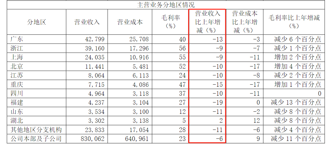 - 光大证券2023年营收及扣非净利双双下滑 董事长赵陵薪酬不降反增至238.33万元对于营业收入下降,光大证券表示:“公司利息净收入18亿元,同比减少3亿元,降幅14%,主要是融资融券息差、同业资金利息和股票质押收入减少;手续费及佣金净收入49亿元,同比减13亿元,降幅21%,主要是经纪业务、投资银行及资产管理业务手续费变动;投资收益及公允价值变动收益26亿元,同比增加14亿元,增幅117%,主要为公司坚持绝对收益策略,优化投资结构的影响;其他业务收入3.4亿元,同比减少6亿元,降幅63%,为本年度大宗商品基差贸易收入变动。”分地区来看,光大证券除湖北地区以外的营业收入同比增加2%,其他区域的营收均有不同程度的下降。其中,福建、重庆、广东地区的降幅较大,分别为19个百分点、15个百分点和13个百分点。此外,光大证券及子公司主营业务毛利率为23%,较上年减少11个百分点。 图片来源:光大证券2023年年度报告在营收和扣非后净利润双双下滑的情况下,光大证券董事长、执行董事赵陵从公司获得的税前报酬总中国网财经