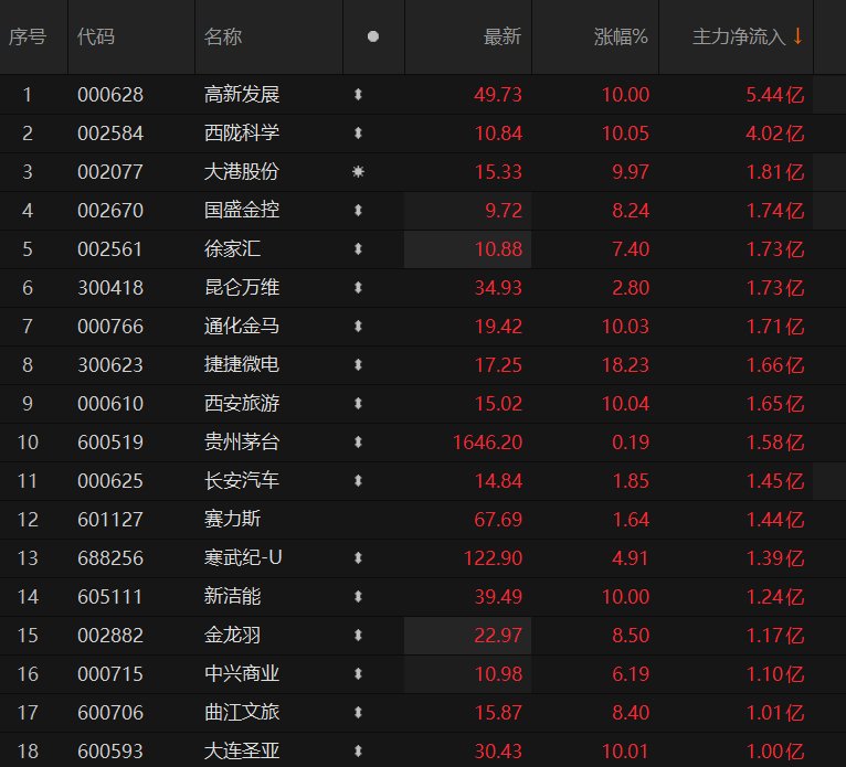 - 18只个股主力资金净流入超1亿元 高新发展净流入超5亿元居首转自:中国证券网上证报中国证券网讯 据Choice金融终端数据,截至1月15日11时07分,18只个股主力资金净流入超1亿元。其中,高新发展净流入居首,达5.44亿元,其次为西陇科学、大港股份、国盛金控等。 数据来源:Choice金融终端上海证券报
