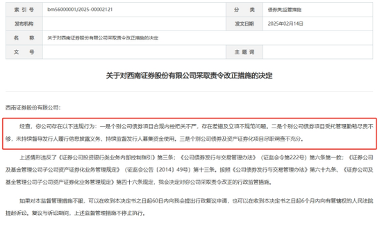 - 西南证券“祸不单行”:“卖子”失败、债券违规遭罚来源:证券之星 今年2月初,西南证券(600369.SH)曾披露其旗下西证国际证券“卖身”进展。最终由于买方无法促使独立贷款人按时向西证国际证券提供独立融资,此次交易的买卖协议在1月28日失效并终止生效。 证券之星注意到,不到一个月后,2月14日,证监会官网发布了《关于对西南证券采取责令改正措施的决定》。决定书显示,西南证券在债券项目上存在多个违规行为,其中包括了个别公司债券项目合规内控把关不严,存在差错及立项不规范等。 西南证券一个月内接连遭遇监管重罚与资本运作挫折,让这家总部位于重庆的券商面临业务合规性与战略收缩的双重考验。作为西部券商的代表,西南证券近年来在债券承销、跨境业务等领域持续发力,但此次事件也暴露出其在风险管控与子公司治理上的问题。 01. 债券业务违规背后的风控漏洞 2月14日,证监会对西南证券出具《行政监管措施决定书》直指其债券业务存在三大违规行为,首当其冲是合规内控把关不严,在个别公司债券项目中出市场资讯