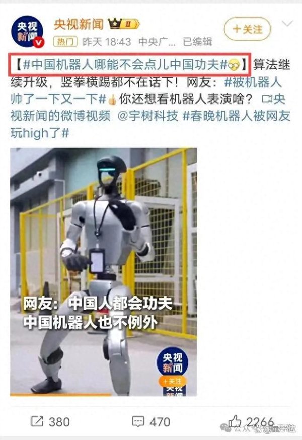 - 宇树机器人大秀中国功夫 央视点赞国产人形机器人最近两天鲨疯了!!当红炸子鸡宇树机器人一套中国功夫下来,连央妈都带头玩梗:中国机器人哪能不会点儿“Chinese Kungfu”(doge) 出拳、扭腰灵活转身、空中回旋踢,那叫一个丝滑流畅。 而且官方视频号一发布,宇树科技CEO王兴兴也忍不住现身评论区惊叹: 除此之外,曾因在深圳街头散步而走红网络的众擎机器人,时隔1个多月也再次出来大秀肌肉。最新视频中,成功完成全球首个前空翻挑战。 一时间,外国网友们纷纷承认,中国机器人已经开始处于领先地位了~ 国产机器人开始大秀肌肉还是来详细看下最新视频。先说宇树科技,这家公司自从走红蛇年春晚后,新动作那叫一个接连不断。就在上周三,CEO王兴兴还在小红书发了段自家机器人的跳舞视频来自证“清白”。 原因嘛,主要是宇树机器人每次更新的视频效果太牛,网友们总是忍不住质疑是AI或快科技官方