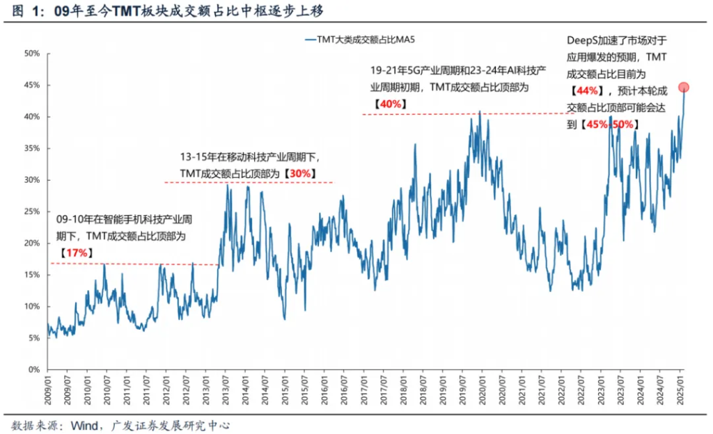 - 广发证券:科技狂潮冲破“40%法则”了吗?广发证券表示,25年春节前后TMT成交额占比突破40%并持续高位运行,DeepSeek的出现改变了过去2年TMT缺乏基本面支撑的情况,随着重要互联网平台开始接入并加大资本开支的背景下应用端基本面预期大幅改善,并加大对算力的需求,本轮成交占比顶部在45%-50%。 报告摘要 AI产业爆发至今,过去2年TMT的成交拥挤度总是引发市场留意。因为,过去2年只要TMT成交占比接近40%的上限、板块超额收益就会出现阶段回踩。 而25年春节前后,TMT成交额占比突破40%并持续高位运行,40%的隐形约束似乎在本轮失效了。 1.本轮TMT的情绪顶部在哪里? 每一轮大型科技产业周期中,TMT成交额占比中枢均会经历明显的提升,其背后来自于成分股数量和市值占比增加、投资者对于基本面预期的改善。当前TMT成交额占比为【44%】,从过往和美国对比经验来看,有可能本轮成交占比顶部在【45%-50%】。 2.在一轮市场资讯