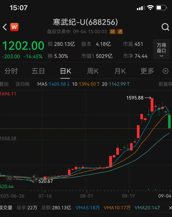 - 寒武纪大跌14%险守1200元关口 市值两天“蒸发”超900亿9月4日,近期股价大涨的AI芯片股寒武纪(688256.SH)大跌14.45%,当天收盘价下探至1202元,近两个交易日总市值“蒸发”超过900亿元。股价登顶后震荡下行寒武纪近期股价大涨始于7月10日,仅用了一个多月,公司股价从低点的520.67元攀升至8月28日的1587.91元,28日当天也超越贵州茅台的收盘价1446.10元,寒武纪也被股民戏称为“寒王”。不过,股价创下新高后寒武纪未能延续涨势。8月29日,寒武纪股价下跌6.01%,9月1日—2日,寒武纪股价在1358元—1540元间震荡。9月3日,寒武纪下跌5.07%,9月4日,股价大跌14.45%。仅仅3日、4日两个交易日,寒武纪的总市值也从约5937亿元降至5029亿元。近期寒武纪股价波动或是多方因素影响所致。9月1日前,市场有传闻称阿里云通义千问大模型面临算力缺口,阿里紧急追加寒武纪思元370芯片订单至15万片。与此同时,高盛又一次上调寒武纪股价,称寒武纪宣布的二季中国经济观察网