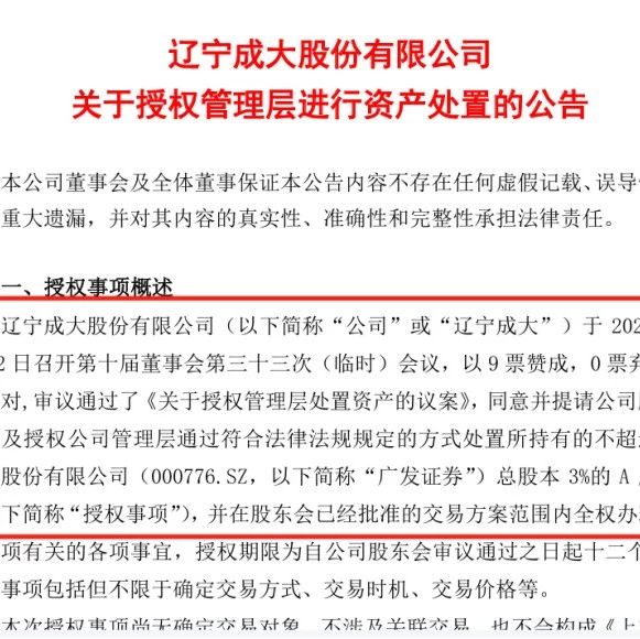 - 头部券商股权生变!辽宁成大拟处置广发证券不超3%股份长期稳定的“广发三宝”股权结构面临变动。 2月12日晚间,广发证券第二大股东辽宁成大公告,审议通过授权管理层处置所持有的不超过广发证券总股本3%的A股股份。以2月12日广发证券A股总市值1218亿元来算,处置市值最高可达36.54亿元。 值得一提的是,长期稳定的股权结构一直被视为广发证券核心竞争力之一,主要股东吉林敖东、辽宁成大和中山公用三家上市公司,市场俗称“广发三宝”,25年来一直位列前三大股东。此番,辽宁成大处置不超3%广发证券股权后,谁将接盘将受到外界关注。 券商中国记者注意到,广发证券上述二股东辽宁成大刚刚完成董事会换届,辽宁成大的控股股东将由辽宁国资公司变更为粤民投旗下韶关高腾,实际控制人将由辽宁省国资委变更为无实际控制人。 2月12日,辽宁成大午后大涨超5%,收于11.85元/股,上涨5.8%。 辽宁成大拟处置广发证券不超3%股份 2月12日晚间,辽宁成大公告称,该公司于2月12日召开董事会,审议通过授权管理层通过券商中国