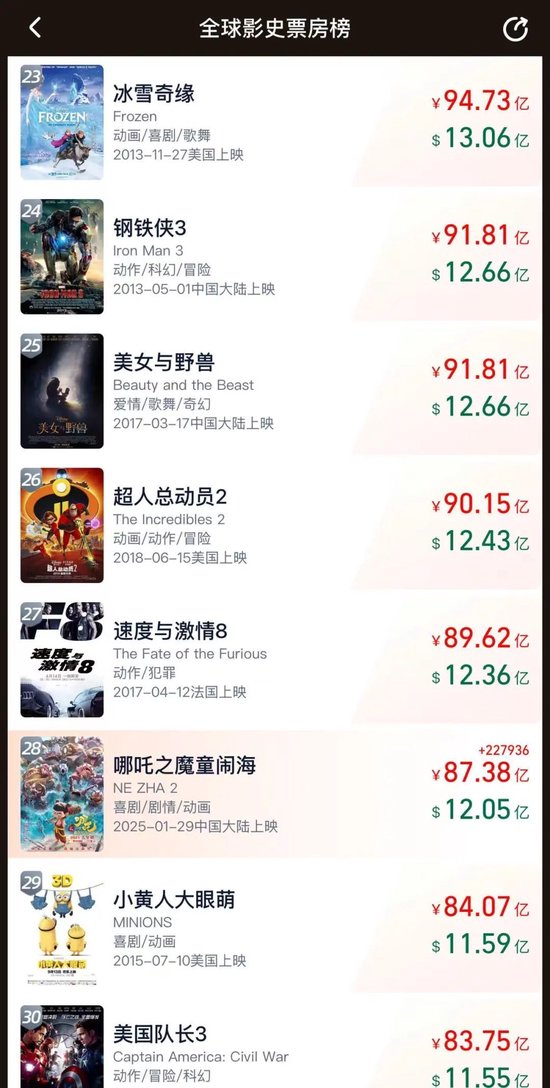 - 预测票房142亿,《哪吒2》有望全球影史前十!业内:饺子收入可能达10亿!光线传媒回应“被偷票房损失千万”原标题:预测票房142亿,《哪吒2》有望全球影史前十!业内:饺子收入可能达10亿!光线传媒回应“被偷票房损失千万”,其股价5天翻倍创新高 截至2月11日上午12时,影片《哪吒之魔童闹海》(下称《哪吒2》)总票房(含预售)已突破87亿元,超过《小黄人大眼萌》《美国队长3》,排名全球影史票房榜第28,也是票房TOP30影片唯一非好莱坞影片!而《哪吒2》的观影人次也已经达到1.75亿。 目前,猫眼专业版给《哪吒2》的预测票房已经超过142亿元。如果成真,《哪吒2》将力压《蜘蛛侠:英雄无归》位列全球电影票房榜第7名,排在《复仇者联盟3》身后。 光线传媒股价5天翻倍 业内:饺子导演收入或达10亿元 随着《哪吒2》票房狂飙,光线传媒(300251.SZ)股价一天一个样。春节后不到5个交易日,股价已经翻倍,2月11日更是创下历史新高,市值突破550亿元。 据猫眼专业版资料,《哪每日经济新闻