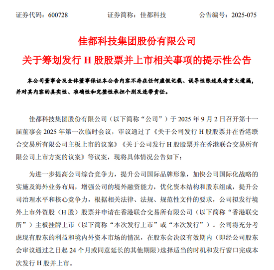 - 佳都科技,筹划H股上市9月3日,佳都科技方面对中国证券报记者称,公司筹划H股上市,主要出于加快国际化战略布局考虑,募集资金主要用于增强公司研发能力等方向,后续进展以公司公告为准。 佳都科技9月2日晚披露关于筹划发行H股股票并上市相关事项的提示性公告。公告显示,为进一步提高公司综合竞争力,提升公司国际品牌形象,加快公司国际化战略的实施及海外业务布局,增强公司的境外融资能力,优化资本结构和股东组成,提升公司治理水平和核心竞争力,公司拟发行境外上市外资股(H股)股票并申请在香港联交所主板挂牌上市。 公司将充分考虑现有股东的利益和境内外资本市场的情况,在股东会决议有效期内(即经公司股东会审议通过之日起24个月或同意延长的其他期限)选择适当的时机和发行窗口完成本次发行H股并上市。 来源:公司公告 截至目前,公司正积极与相关中介机构就本次发行H股并上市相关工作进行商讨,除本次董事会审议通过的相关议案外,其他关于本次发行H股并上市的具体细节尚中国证券报