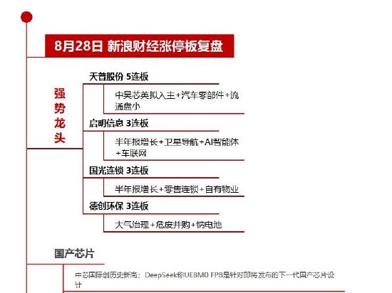 - 8月28日沪深两市涨停分析:天普股份5连板 启明信息3连板 国光连锁3连板 德创环保3连板【8月28日沪深两市涨停分析】创业板指涨3.82%,科创50指数大涨超7%,AI科技板块集体走强。天普股份5连板,一图看懂>>股市直击