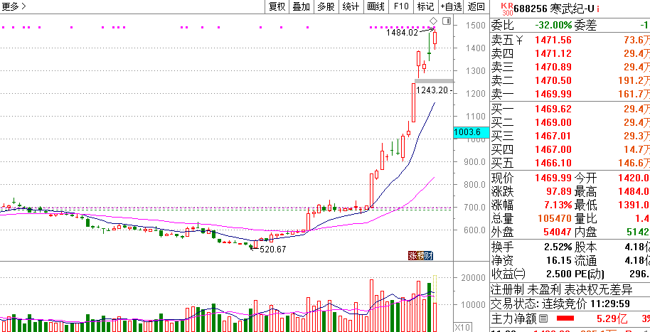 - 寒武纪引领中国A股进入新纪元!8月28日寒武纪超越贵州茅台,成为沪市第一高价股,1484最高价出现,珠峰的吉祥数字触摸其中,这个吉祥数字将会继续打破,进入到一个全新的寒武纪时代。中国A股长期吃药喝酒的行情,将会被以寒武纪为龙头的企业所替代,进入到科技创新、中国智造的新纪元。作为投资者你如果看不清未来,就跟随寒武纪的步伐进行快速布局,这一波红利正在袭来。寒武纪成为沪市第一高价股的必然 行业前景广阔:人工智能技术的快速发展,使得对AI芯片的需求大幅增加。寒武纪作为专注于AI芯片设计的公司,其产品刚好契合市场需求,受益于行业的快速发展。稀缺性优势:寒武纪是“科创板AI芯片第一股”,在A股市场中具有稀缺性。市场上主营业务为算力芯片的...A股伪解释