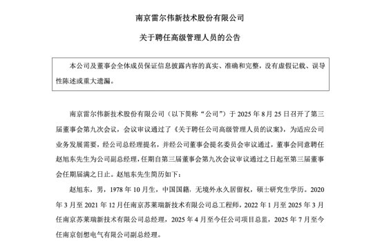 - 赵旭东入职雷尔伟4个月晋升副总经理,公司上半年营收1.65亿,其他副总年薪在48万至56万之间文/新浪财经上海站 时行工作室 8月26日,雷尔伟科技(以下简称“雷尔伟”)发布公告称,公司董事会已批准聘任赵旭东为副总经理。 雷尔伟是国内轨道交通领域的核心零部件制造商,主要客户包括中国中车各主机厂及全国各大铁路局,客户集中度高、合作关系稳固。 2025年上半年,公司实现营业收入1.65亿元,同比增长10.15%;归母净利润0.29亿元,同比增长3.21%。 根据公告,赵旭东自2020年3月至2021年12月在南京苏莱瑞新技术有限公司担任总工程师,随后于2022年1月至2025年3月出任该公司总经理。 2025年4月起,他进入雷尔伟担任项目总监,并自2025年7月兼任公司控股子公司南京创想电气有限公司副总经理。南京创想电气是雷尔伟持股95.83%的子公司,其业务与母公司在技术和供应链层面高度协同。 此外,2024年年报数据显示,雷尔伟副总经理薪酬区间为新浪证券