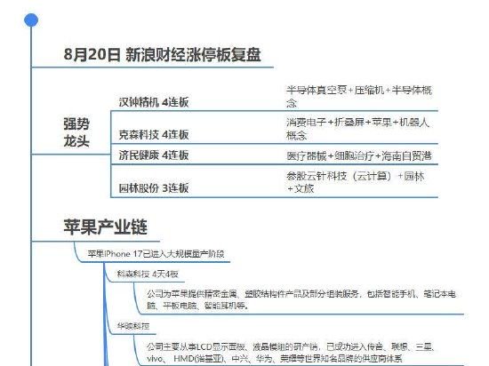 - 集体异动拉升!科森科技,四连板!iPhone17,突传大消息!消费电子板块集体拉升,其中科森科技(603626)连续第四天涨停。光伏概念股盘初走强。 8月20日开盘,A股三大指数集体低开,沪指跌0.28%,深证成指跌0.61%,创业板指跌1.14%。开盘后三大指数震荡走高,沪指率先翻红。盘面上,CPO、玻纤、PCB等概念回调;光伏板块走强。 券商板块盘中拉升,哈投股份一度涨逾8%,随后回落;国金证券涨逾4%,中银证券、华西证券等涨幅居前。 消费电子板块拉升 消费电子板块盘初活跃,科森科技(603626)四连板,华映科技、朝阳科技涨停,安洁科技、宜安科技、福蓉科技等冲高。 消息面上,8月19日,有媒体报道称,苹果iPhone17已进入大规模量产阶段。作为苹果iPhone的主要代工生产商,富士康郑州厂区正开展旺季招工。 白酒股延续强势,酒鬼酒涨停,舍得酒业、古井贡酒、老白干酒、泸州老窖等跟涨。 中信证券研报认为,白酒行业正在快速筑底,龙头企业或把握当前时间段证券时报e公司