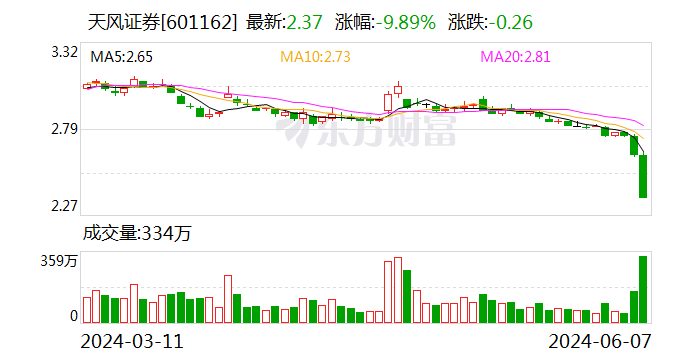 红星资本局6月10日消息,6月7日,天风证券(601162.SH)股价午间收盘前跳水跌停,收盘报2.37元/股,跌幅达9.89%,股价创历史新低。