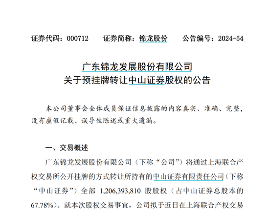 6月5日,锦龙股份发布公告称,将在上海联合产权交易所以公开挂牌的方式,转让其所持有中山证券的全部12.06亿股股权,占中山证券总股本67.78%。