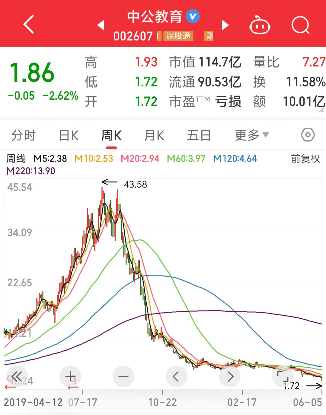 据统计,中公教育已经连续三天盘内触及跌停,4日股价相对于2020年11月5日的高点43.58元/股(前复权)累计跌超95%。值得注意的是,近期市场流传该公司破产、股东质押爆仓等消息,中公教育多次回应消息不实。