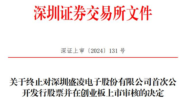 深交所于2023年5月19日依法受理了盛凌电子首次公开发行股票并在创业板上市的申请文件,并依法依规进行了审核。日前,盛凌电子保荐人向深交所提交了《申万宏源证券承销保荐有限责任公司关于撤回深圳盛凌电子股份有限公司首次公开发行股票并在创业板上市申请文件的申请》。根据《深圳证券交易所股票发行上市审核规则(2024 年修订)》第六十二条的有关规定,深交所决定终止对盛凌电子首次公开发行股票并在创业板上市的审核。