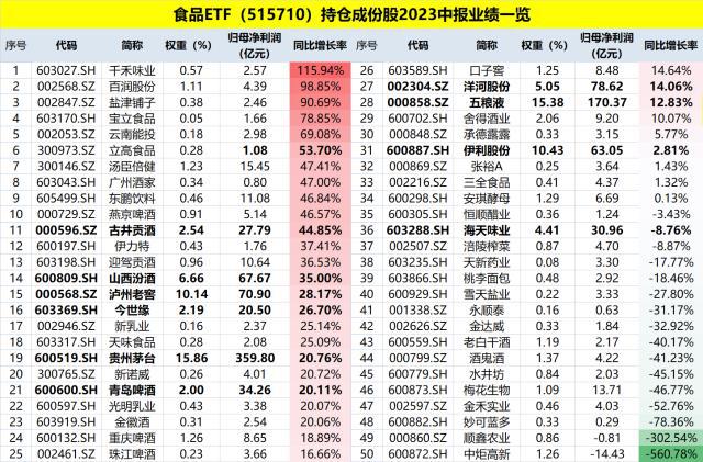数据来源:沪深交易所。风险提示:食品ETF(515710)被动跟踪中证细分食品饮料产业主题指数,该指数基日为2004.12.31,发布于2012.4.11,指数成份股构成根据该指数编制规则适时调整。文中指数成份股仅作展示,个股描述不作为任何形式的投资建议,也不代表管理人旗下任何基金的持仓信息和交易动向。基金管理人评估的本基金风险等级为R3-中风险,适合适当性评级C3以上投资者。任何在本文出现的信息(包括但不限于个股、评论、预测、图表、指标、理论、任何形式的表述等)均只作为参考,投资人须对任何自主决定的投资行为负责。另,本文中的任何观点、分析及预测不构成对阅读者任何形式的投资建议,亦不对因使用本文内容所引发的直接或间接损失负任何责任。基金投资有风险,基金的过往业绩并不代表其未来表现,基金管理人管理的其他基金的业绩并不构成基金业绩表现的保证,基金投资需谨慎。