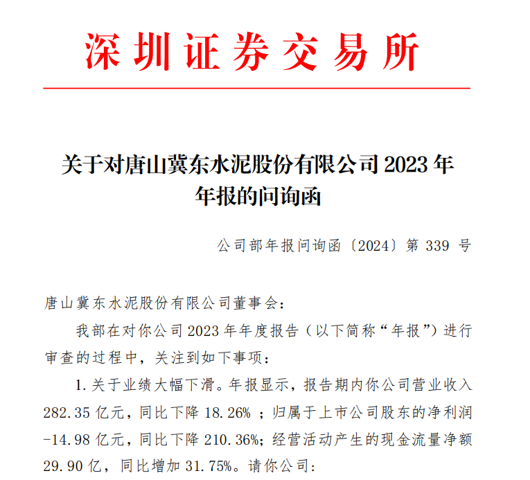 据此,冀东水泥被要求说明营业收入同比大幅下降的原因及合理性;说明扣非后净利润大幅下滑、远超营业收入下降幅度的原因等。