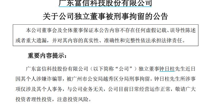 6月6日晚间,富信科技(688662)公告称,公司近日收到独立董事钟日柱家属的通知,钟日柱因其个人涉嫌诈骗罪,被广州市公安局越秀区分局刑事拘留。