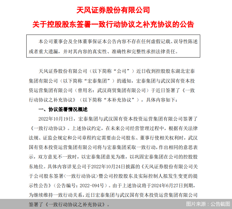 据悉,2022年10月19日,宏泰集团与武汉国有资本投资运营集团有限公司签署了《一致行动协议》。上述协议约定,在未来公司经营管理过程中,根据有关法律法规、证监会规定和公司章程约定需要由公司股东、董事行使相关权利时,武汉国有资本投资运营集团有限公司将与宏泰集团采取一致行动,作出相同的意思表示,双方意见不一致时,以宏泰集团意见为准,以巩固宏泰集团在天风证券的控股股东地位。