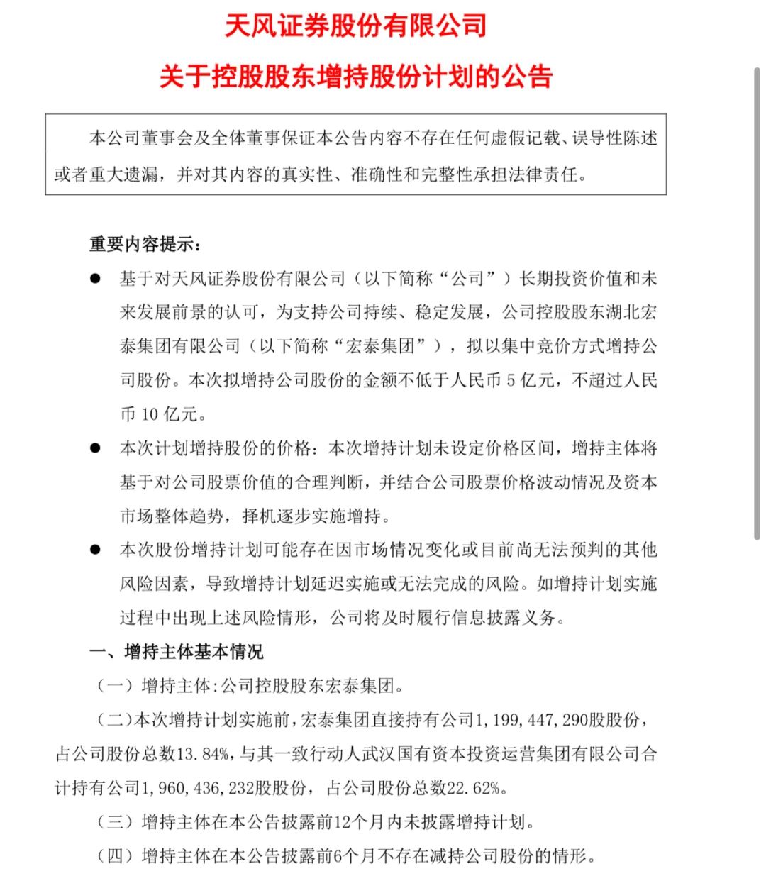6月11日盘前,天风证券发布公告称,因对公司未来发展的坚定信心及对公司长期价值的高度认可,控股股东湖北宏泰集团计划于2024年6月11日至2025年6月11日增持不超10.0亿元股份。本次增持计划实施前,湖北宏泰集团持有天风证券11.99亿股,占公司总股本的13.84%。
