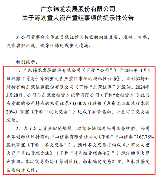 公告显示,锦龙股份持有中山证券67.78%股权,持有东莞证券40%股份。公司称,为降低公司的负债率,优化财务结构,公司拟转让所持有的东莞证券股份。2024年3月28日,公司与金控资本就其有意收购公司持有的东莞证券30,000万股股份(占东莞证券总股本的20%)事宜达成了初步意向,并签订了交易备忘录。