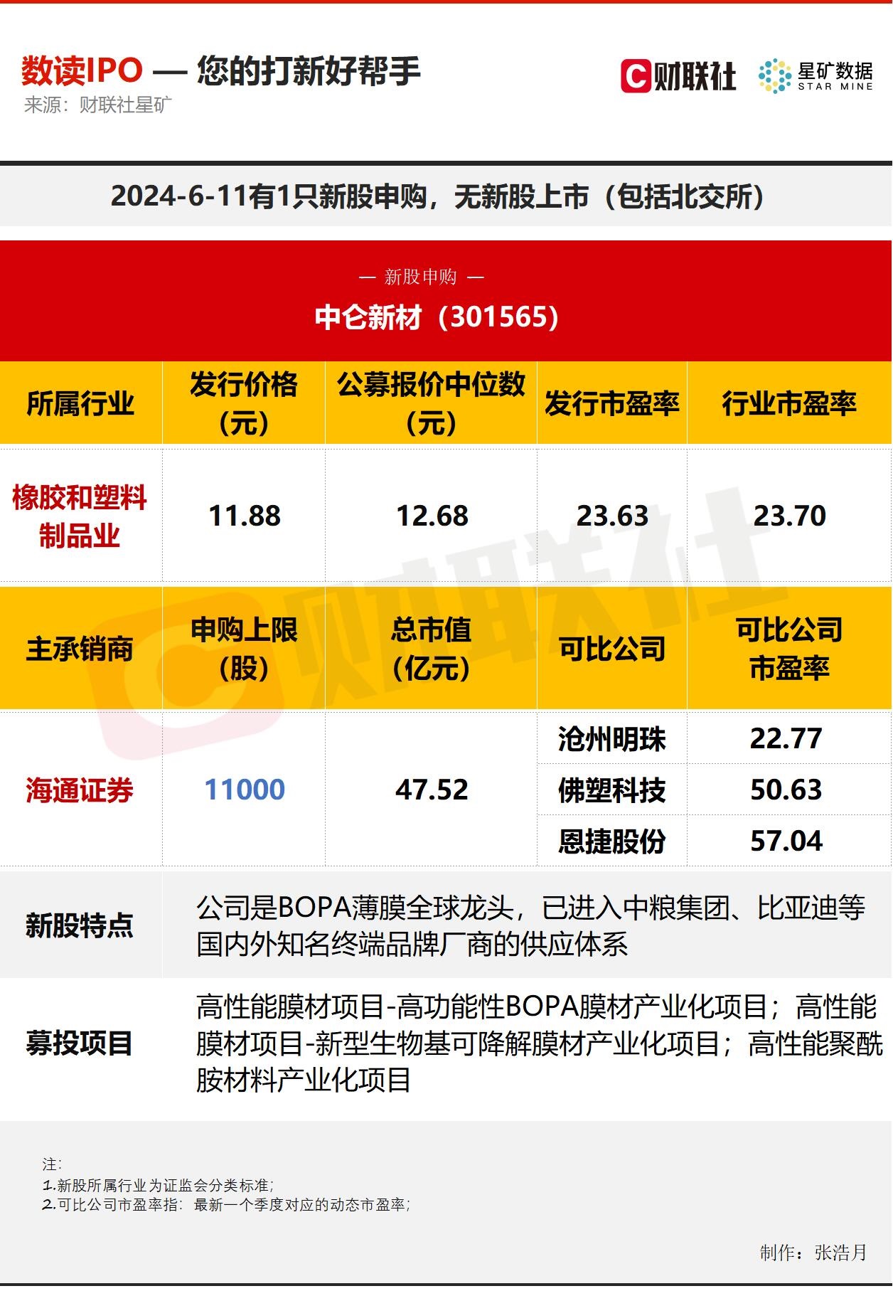财联社6月11日讯,今日有1只新股申购,为创业板的中仑新材;无新股上市。