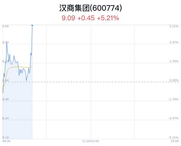 06月11日,汉商集团(600774)股价大幅上涨,截至10点10分,汉商集团上涨5.21%,报9.09元/股,成交9490万元,换手率3.67%,振幅6.83%。