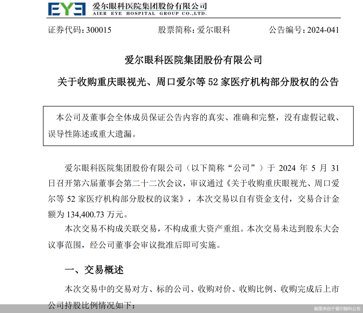 爱尔眼科最新公告显示,公司于5月31日召开第六届董事会第二十二次会议,审议通过《关于收购重庆眼视光、周口爱尔等52家医疗机构部分股权的议案》,拟收购重庆眼视光、周口爱尔等52家医疗机构部分股权,本次交易以自有资金支付,交易合计金额为13.44亿元。
