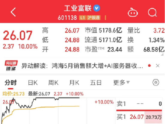 6月6日,A股算力产业链沸腾。工业富联今日上午大幅拉升,截至发稿,工业富联(601138.SH)涨停,报26.07元/股,成交金额68.58亿元,最新市值5178.6亿元。