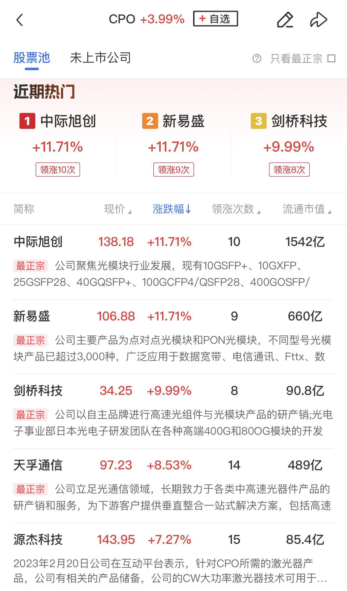 板块上,CPO概念涨幅居前,威尔高、东田微、剑桥科技涨停,新易盛、中际旭创涨超10%,双双创历史新高,天孚通信、致尚科技、源杰科技、联特科技等个股涨幅居前。