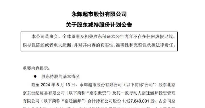 根据永辉超市6月14日晚间公告,北京京东世纪贸易有限公司(简称“京东世贸”)拟在3个月内通过大宗交易方式减持所持有的公司股份不超过1.82亿股,占公司总股本比例不超过2%。
