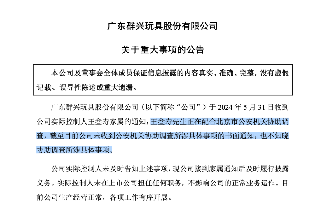 6月2日晚间,群兴玩具公告称,公司于2024年5月31日收到公司实际控制人王叁寿家属的通知,王叁寿正在配合北京市公安机关协助调查。