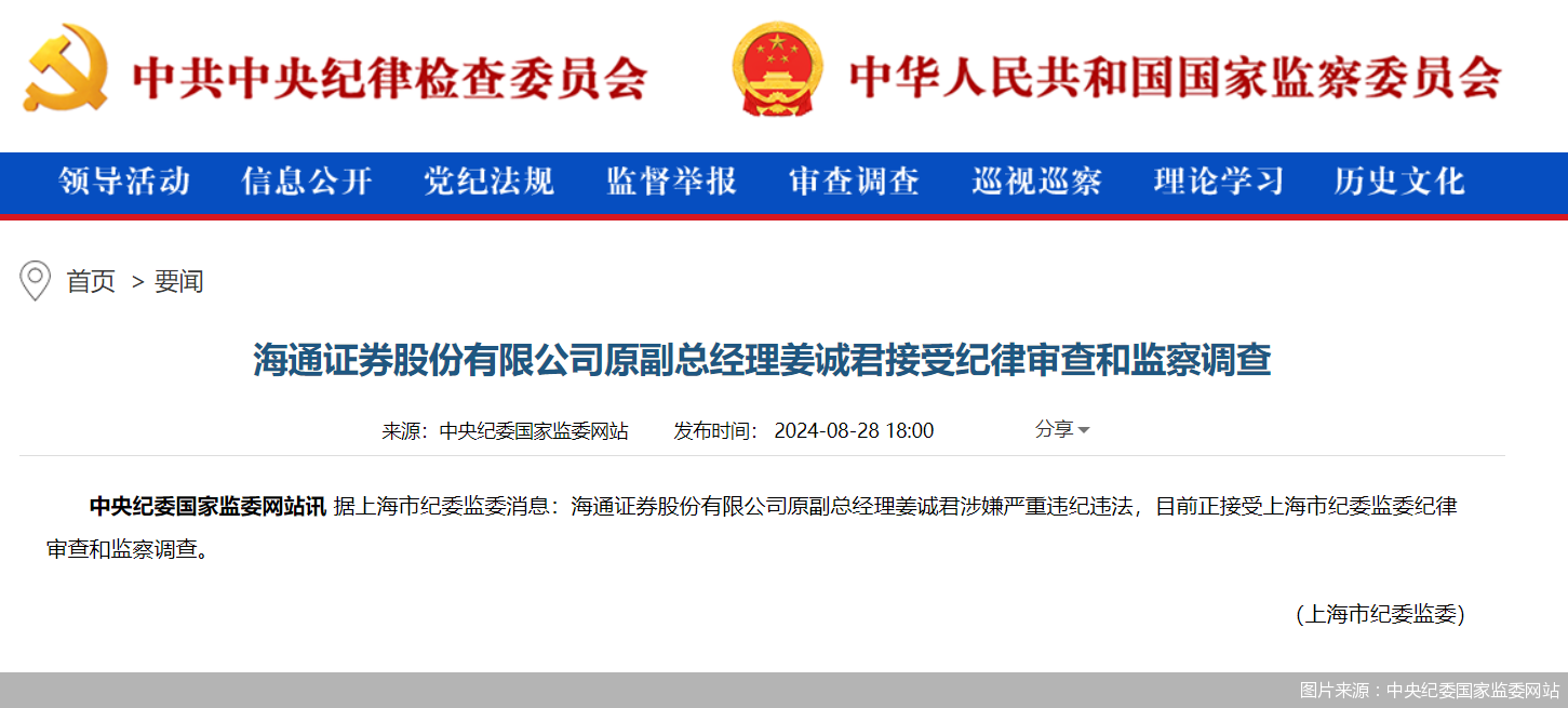 (记者 郝彦)8月28日,据中央纪委国家监委网站发布,上海市纪委监委发布消息称,海通证券原副总经理姜诚君涉嫌严重违纪违法,目前正接受上海市纪委监委纪律审查和监察调查。