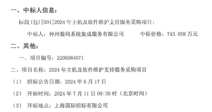 第一财经记者注意到,今日网络上流传一张图,内容为神州数码系统集成服务有限公司(下称神州数码系统集成)中标了一个2024年主机及软件维护支持服务采购项目,招标人为上海证券交易所和上交所技术有限责任公司。一些网民质疑上交所交易系统延迟是该中标公司的原因。