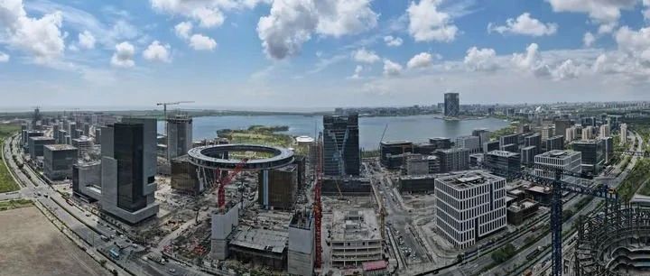 面积达5.56平方公里、正圆形的滴水湖,是临港新片区最具识别度的标志性景观。位于湖泊北岸的滴水湖金融湾,高楼林立、建设繁忙,正以肉眼可见的速度“拔节生长”。