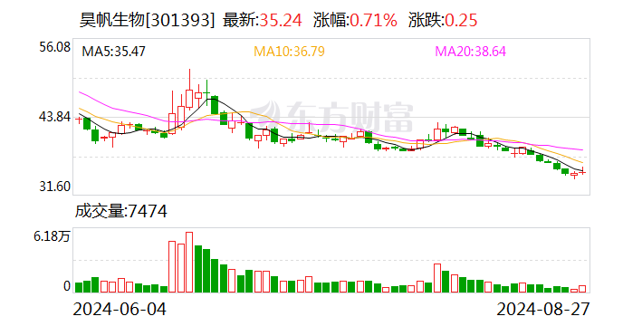 昊帆生物(SZ301393,收盘价:35.24元)8月28日发布半年度业绩报告称,2024年上半年营业收入约2.25亿元,同比增加7.12%;归属于上市公司股东的净利润约6581万元,同比增加12.04%;基本每股收益0.61元,同比减少16.44%。