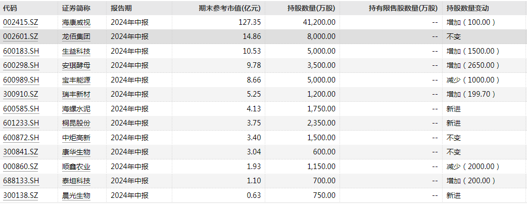重阳战略持有新和成、移远通信等股票,今年二季度持仓未变。