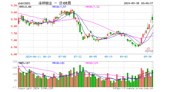 9月30日,洛阳钼业开盘涨3.35%,报8.65元。
