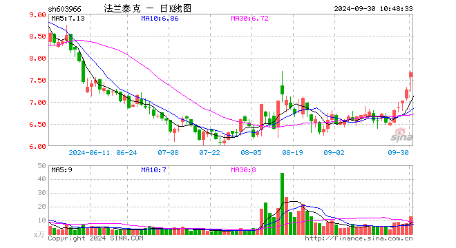 9月30日,法兰泰克开盘涨3.85%,报7.56元。