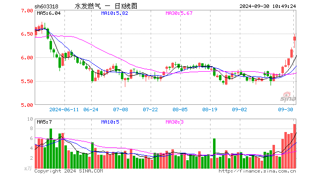 9月30日,水发燃气开盘涨3.08%,报6.35元。