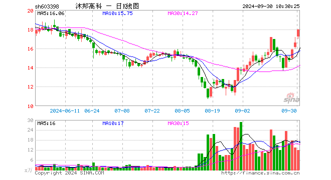 9月30日,沐邦高科开盘涨3.62%,报17.2元。