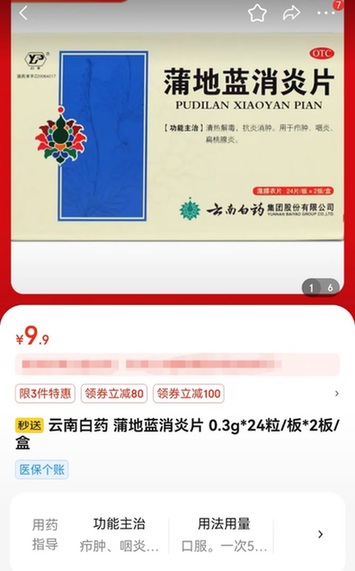 来到药店,刘女士直接让店员帮忙找出蒲地蓝消炎片。“过去吃这个还算管用,我连具体厂家都记下来了。”店员按照刘女士要求,拿来云南白药集团股份有限公司生产的蒲地蓝消炎片。这款药品每盒两板,每板24片,每片0.3克,售价28.5元。回到家以后,刘女士想到在外卖平台也能买药,于是顺便搜了下。结果只要15.8元。而电商平台的秒送服务中,同样选择这家店,同款蒲地蓝消炎片可享受9.9元的特惠价,“一盒居然就贵出十几块钱,这太离谱了。”