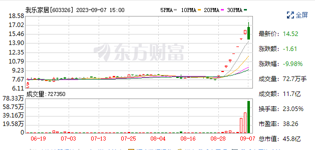 据了解,我乐家居股价9月6日以涨停收于16.13元,其股票自2023年8月28日至9月6日区间连续8个交易日涨停,累计上涨幅度为114.21%,同期上证指数累计上涨幅度为3.07%。